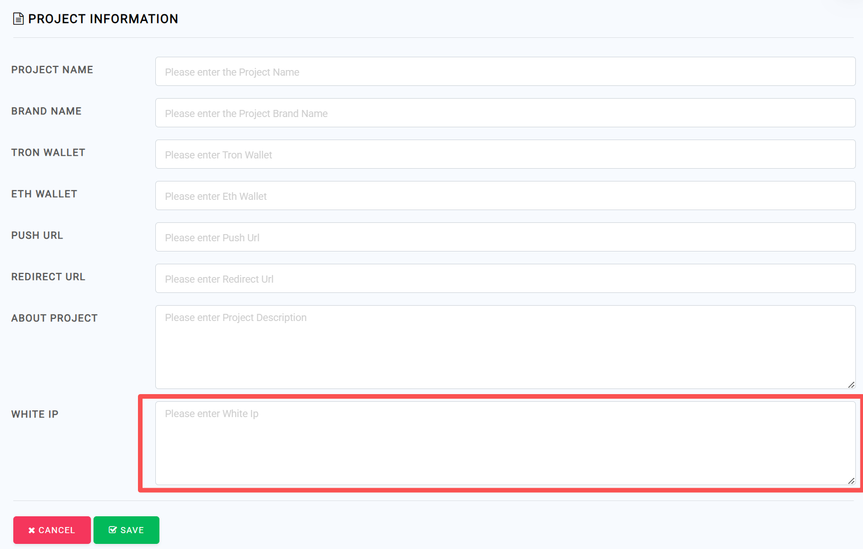 When you create a project and start accepting payments, we will show you our order push IP address. Please use this IP address to confirm that your order has been received correctly.